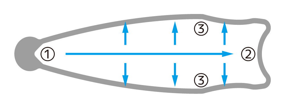 その際、②の方向へデカールを引っ張ってしまうと、①の接着部分がずれてのりがはみ出る場合があるので、引っ張らずデカールを置いていく様な感覚で施工するのがきれいに仕上げるコツです。